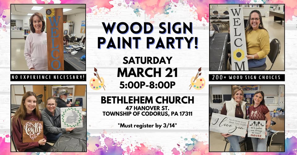 Save the date of Saturday, March 21st @5p for a wood sign paint party fundraiser to support Bethlehem Church The proceeds of this event will go toward building repairs